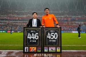 7月27日山东泰山对阵梅州客家的比赛,王大雷首发出战,他也以446场成为中国顶级联赛出场王。在昨天泰山对阵玉昆赛前,王大雷领取了446场的纪念球衣,他同时还领取了中国顶级联赛450次出场纪念球衣。