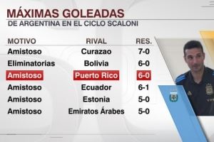 体育资讯10月15日讯 阿根廷队友谊赛6-0大胜波多黎各,根据统计,6-0是斯卡洛尼执教阿根廷队的第二大比分胜利。